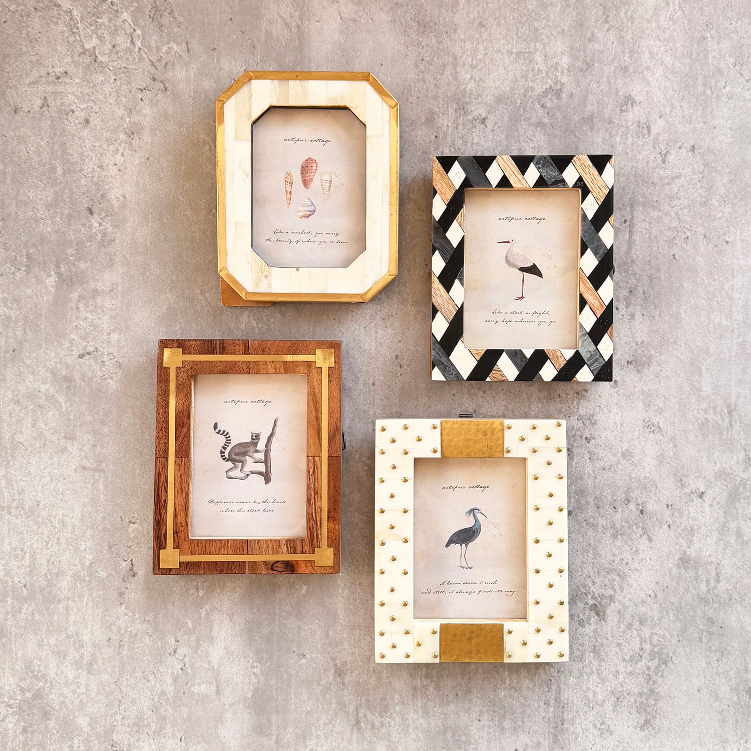 それぞれ異なる素材が持つ色や模様、手仕事による自然な仕上がりと上品さを大切にした、アンティーク感あふれるフォトフレームです。