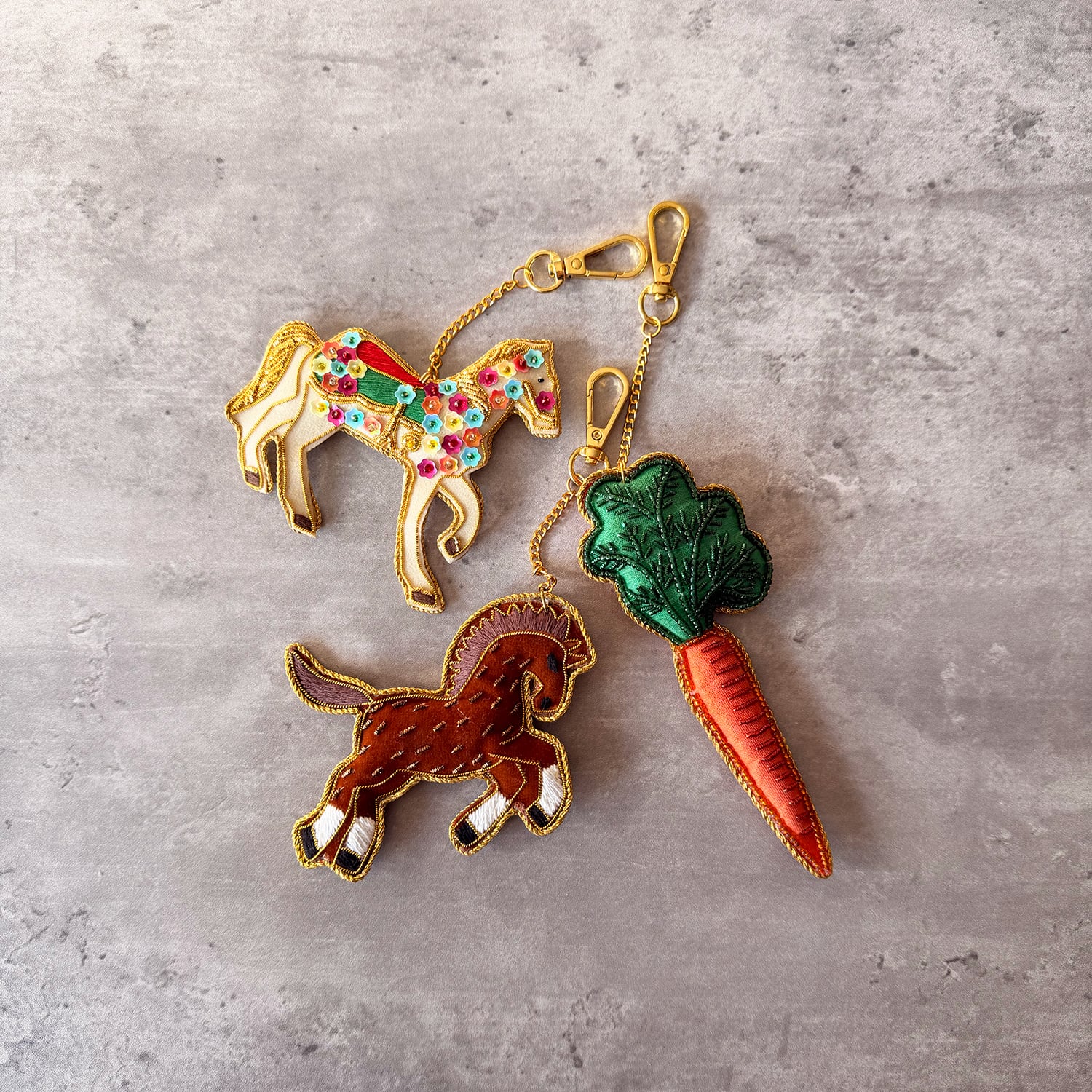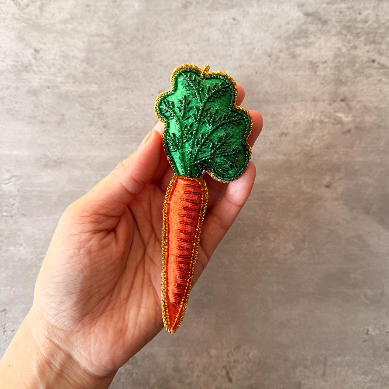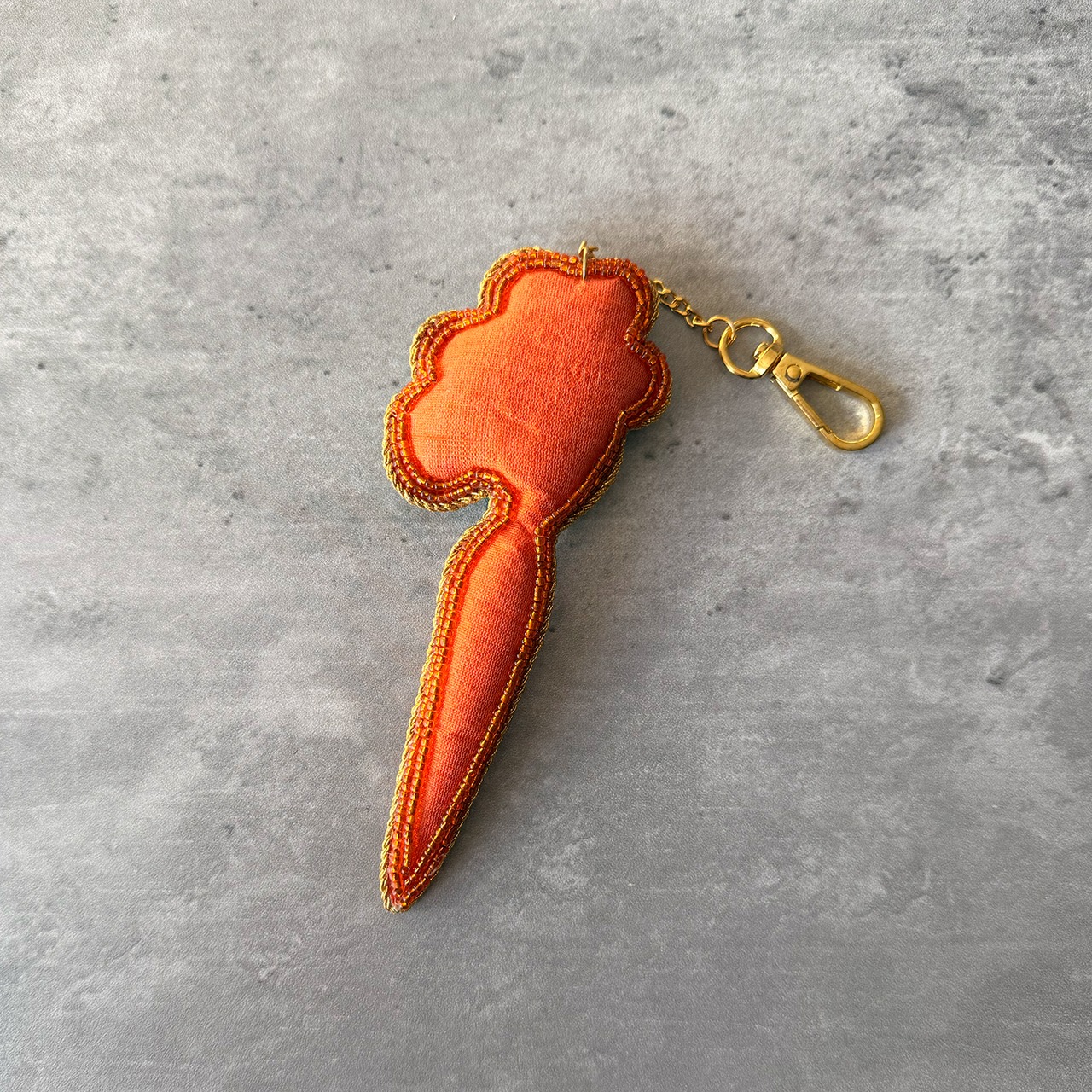ニンジンをモチーフにしたザリ刺繍のチャームです。